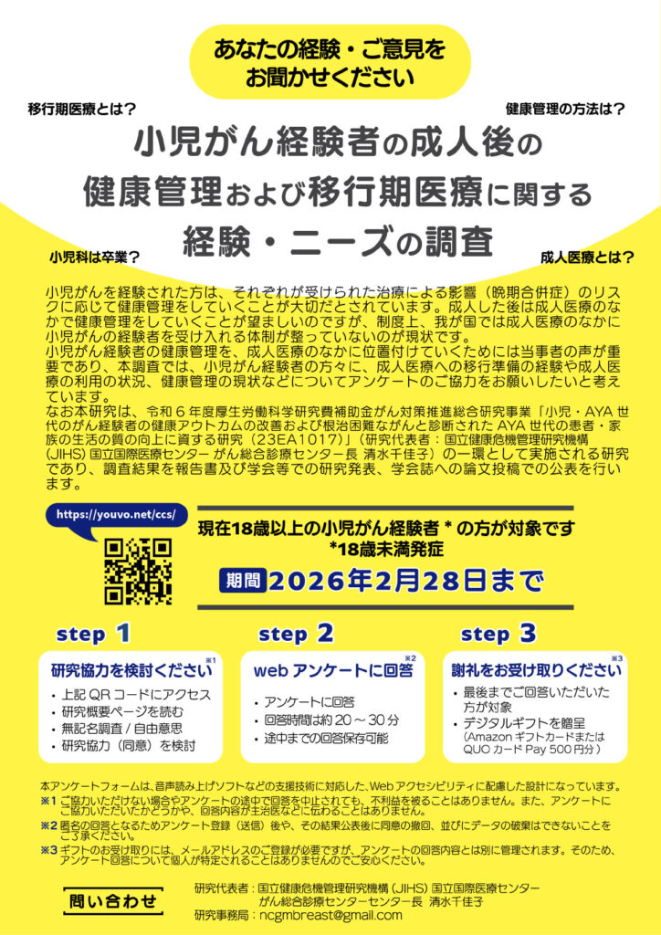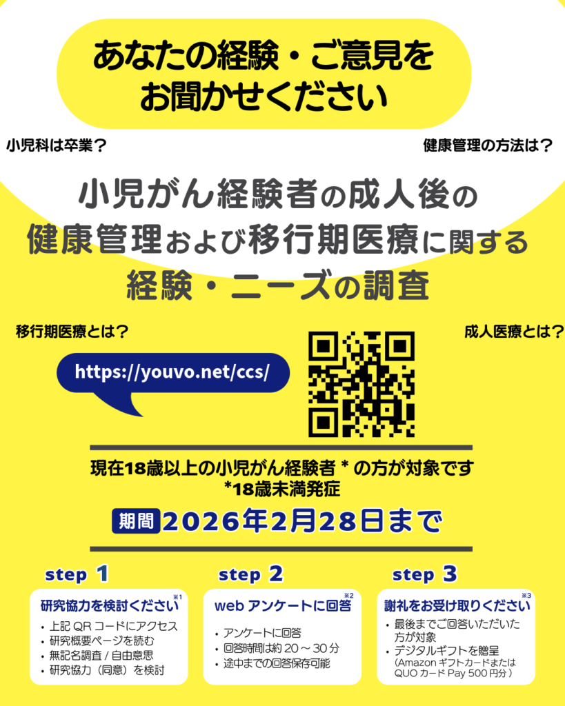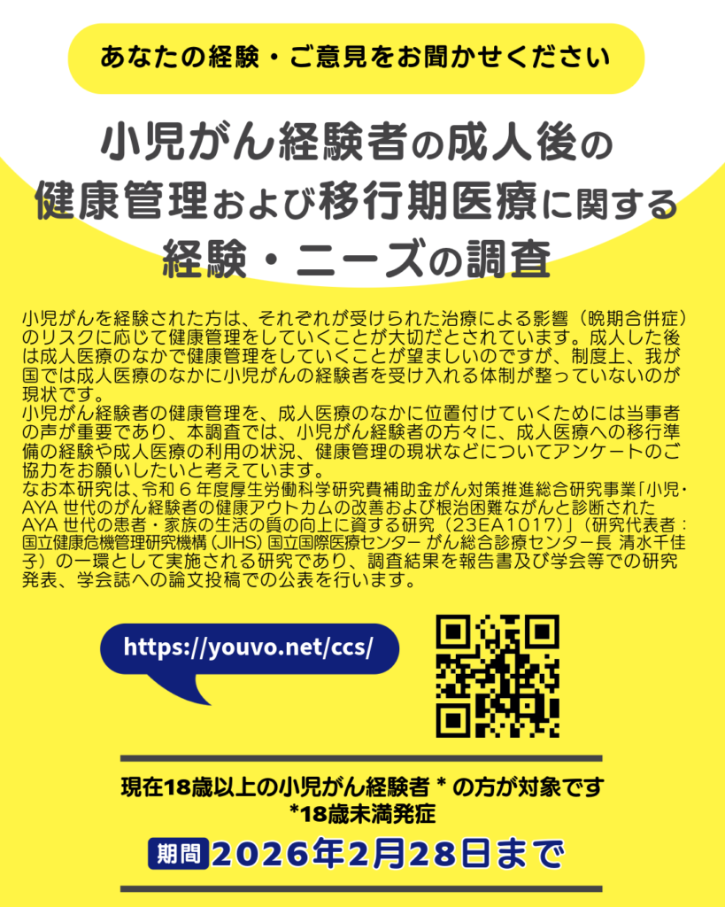 「小児がん経験者の成人後の健康管理および移行期医療に関する経験・ニーズの調査」ご協力のお願い